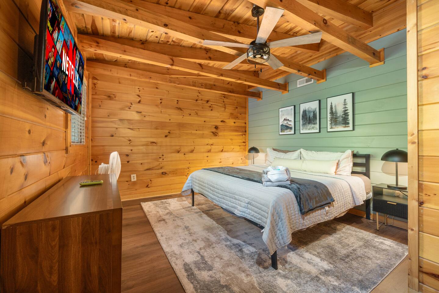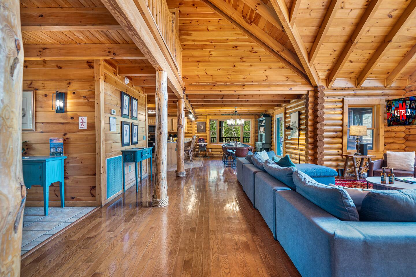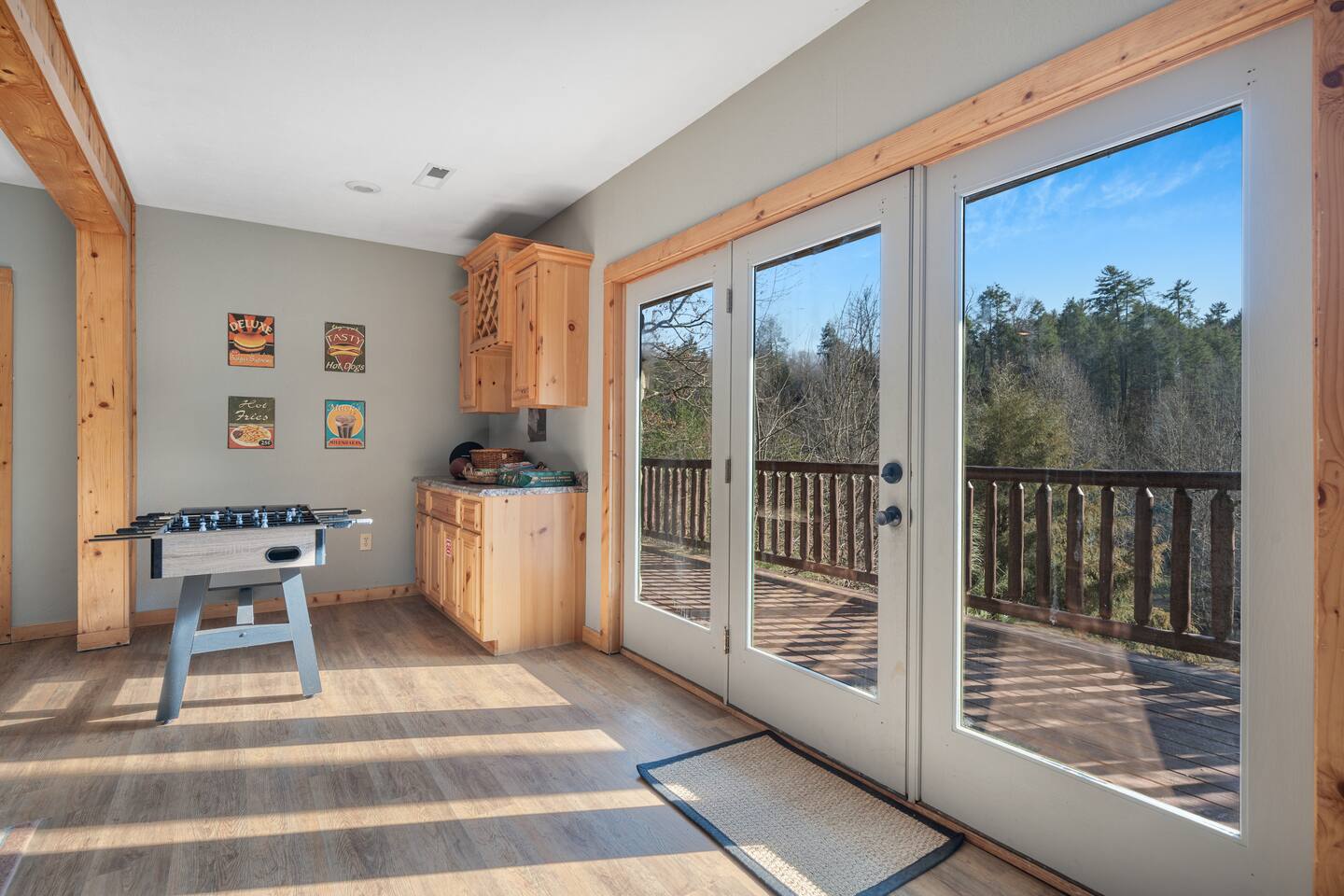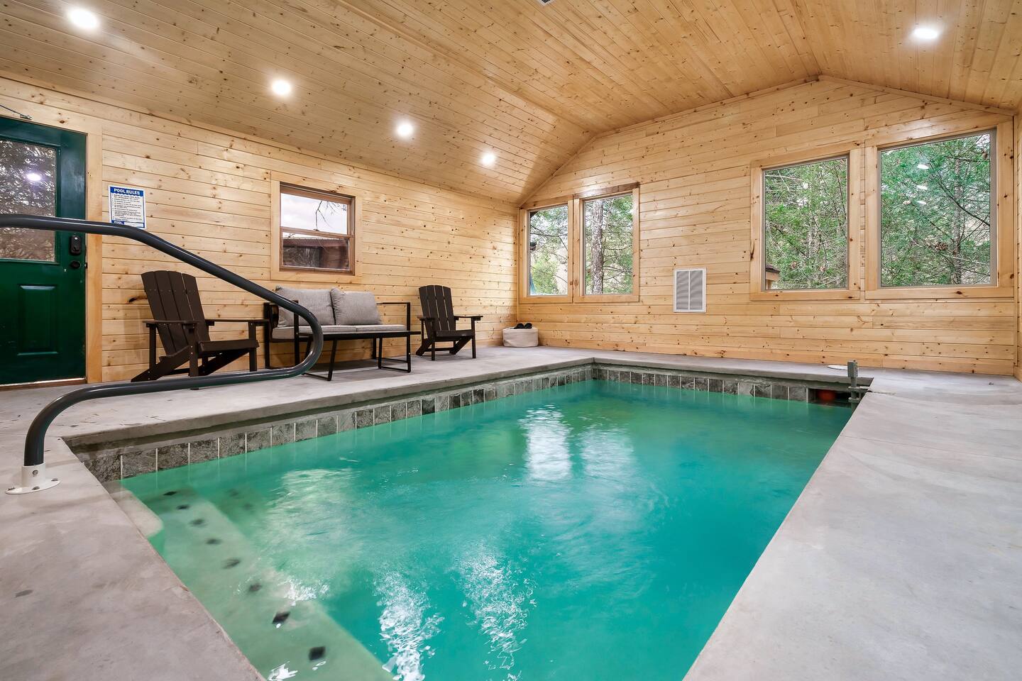 Black Bear Hideaway is a Spacious 4,500 sq' Luxury Indoor Pool Cabin in the private and beautiful Cedar Falls Resort in the Great Smoky Mountains. It is nestled in between plush evergreens on .86 acres, just in front of a catch and release fishing pond. Located 15 minutes drive from Pigeon Forge, 25 minutes from Dollywood Theme Park and 35 minutes from Gatlinburg. Follow us on FB or Insta: smokymoutainsretreats ► PRIVATE HEATED INDOOR POOL The private heated indoor pool sets this cabin apart from many in the area. It is surrounded by a concrete pool deck and comfortable lounge furniture. There is a railing to help guests enter into the shallow end and plenty of room for everybody to splash and play, no matter the season! This is a private indoor pool meaning it is only accessible to our guests. It is located right at the entrance of the cabin and you can use it all year long (heated). ► BEDROOMS With 3 spacious levels and plenty of room to spread out inside and out, this beautiful log cabin can sleep 16 guests with its 5 large bedrooms & 1 kids room. Main Level: - 1 Master bedroom with 1 King size bed & en-suite bathroom – sleeps 2 - 1 full bathroom Upper Level: - 1 Master bedroom with 1 King size bed and an in-suite bathroom – sleeps 2 - 1 Bedroom with 1 King size bed that shares a full bathroom – sleeps 2 - 1 Bedroom with 1 Queen size bed that shares a full bathroom – sleeps 2 Lower Level: - 1 Bedroom with 2 Queen beds & 2 Twin beds that shares a full bathroom – sleeps 6 - 1 Kids room with one twin bunk beds and many toys – sleeps 2 ► KITCHEN The kitchen is equipped with all the cookware, cutlery, and appliances you need to prepare delicious meals during your stay. Refrigerator, stove, microwave, dishwasher, toaster, blender, tea kettle, Crockpot, Keurig Duo with carafe & single serve pod coffee maker. The dining table comfortably seats 10-12, and there are 4 additional stools at the large kitchen island so everyone in your group can enjoy meals together. ► OUTDOOR GRILL There is a private Gas Grill. We provide the Propane Gas. ► OUTDOOR SPACE After a day of hiking and sightseeing, you have a lot of options to chill: *soak in the private hot tub *enjoy the fresh mountain breeze and beautiful views from our wrap-around balconies/porches *relax by the fire pit. Community fire pit is only 2 min walking distance *take a dip in the pool. Community pool is only 2 min walking distance (open May-September) *fish in the Catch and release pond right underneath the cabin *go for a walk in the Nature trail located within the Community *bring your little ones to the brand new Playground (2 min walking distance) ► FIRE PIT The community fire pit is conveniently located just 2 minutes walking distance. If you plan on using the fire pit, just remember to bring some fire wood (you can find this at the supermarket close by if needed - 7 min drive). ► GAME ROOM All ages will fall in love with this fun space! The room has a billiard table, an air hockey table, a foosball, 2 multi-arcade games and a bar area. You will find an additional full-size refrigerator by the game room to have all your cool drinks available. ► THEATER ROOM Next to the game room you will find the in-home Cinema for a movie night with the family & friends. ► PETS We are a pet friendly cabin and you can bring up to 3 dogs as long as they are house broken/potty trained. We welcome all breeds of dogs and have no restrictions on weight. The pet fee is $175 for the whole stay. ► KIDS TOYS As parents ourselves, we know how convenient it can be to book a place with kids toys, that is why we wanted to provide that experience to our own guests. Please note that all kids toys found in the home are for different ages and the parents or responsible adults will be held liable for the selection of toys used by their children. ► INTERNET/CABLE High Speed Wireless Internet Smart TVs in the living room/game room/theater room as well as in each bedrooms. ► LAUNDRY Full size washer and dryer. ► AMENITIES Our cleaning service provides start-up supplies including: paper towels, dish soap, dish washer soap, kitchen trash can liners, toilet paper, hand soap and bathroom trash liners. Depending on the length of your stay, you may need to purchase additional items when the initial supply runs out. ► PRIVATE PARKING Parking for up to 5 vehicles in the driveway. ► ENTRY The front door is equipped with an electronic keypad, we will send a personalized door code. ► SMOKING No Smoking indoors. You can smoke on the decks though. ** Please favorite the property by clicking "save" or "heart shape" in the upper right-hand corner, this will help you find it again and share with others **