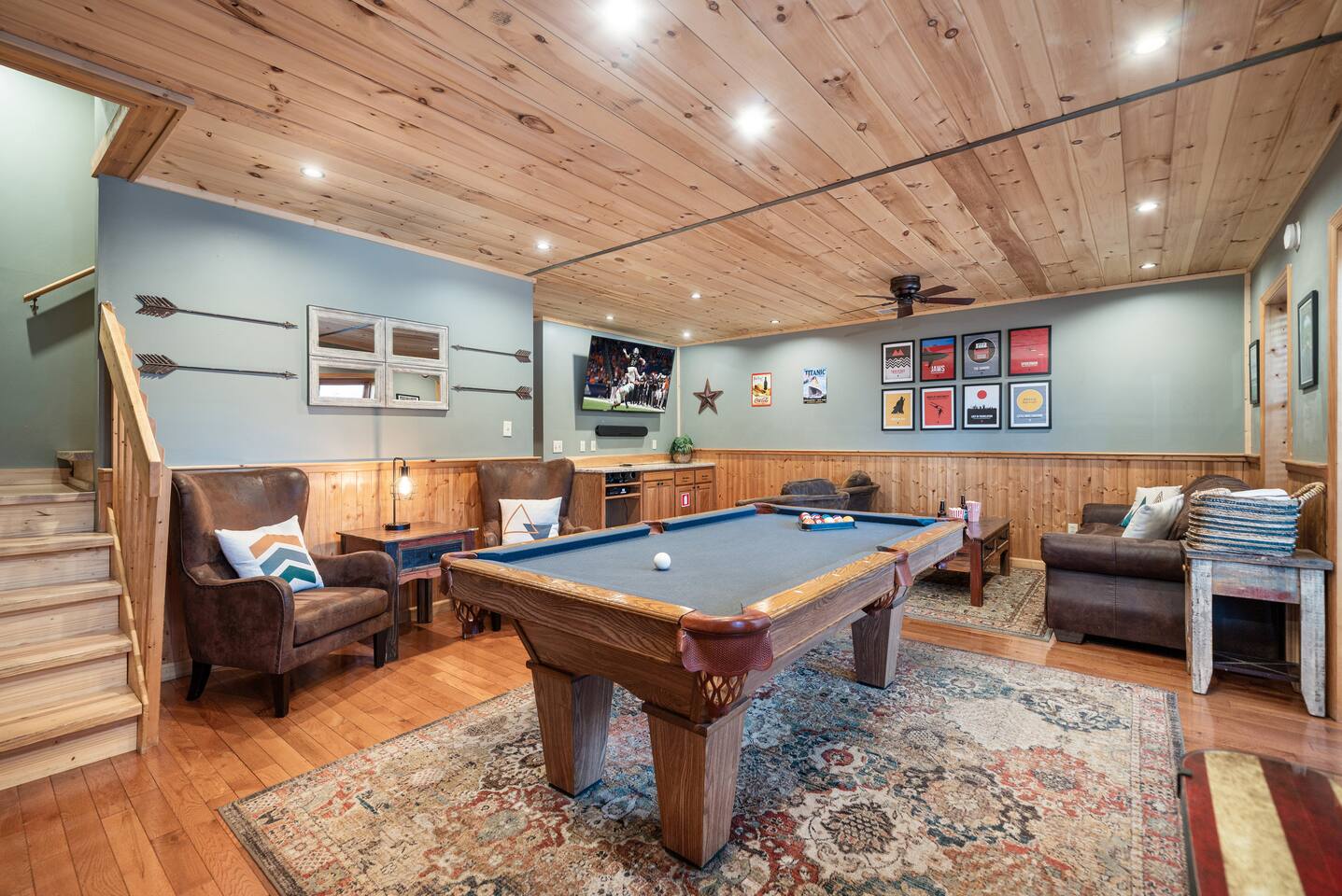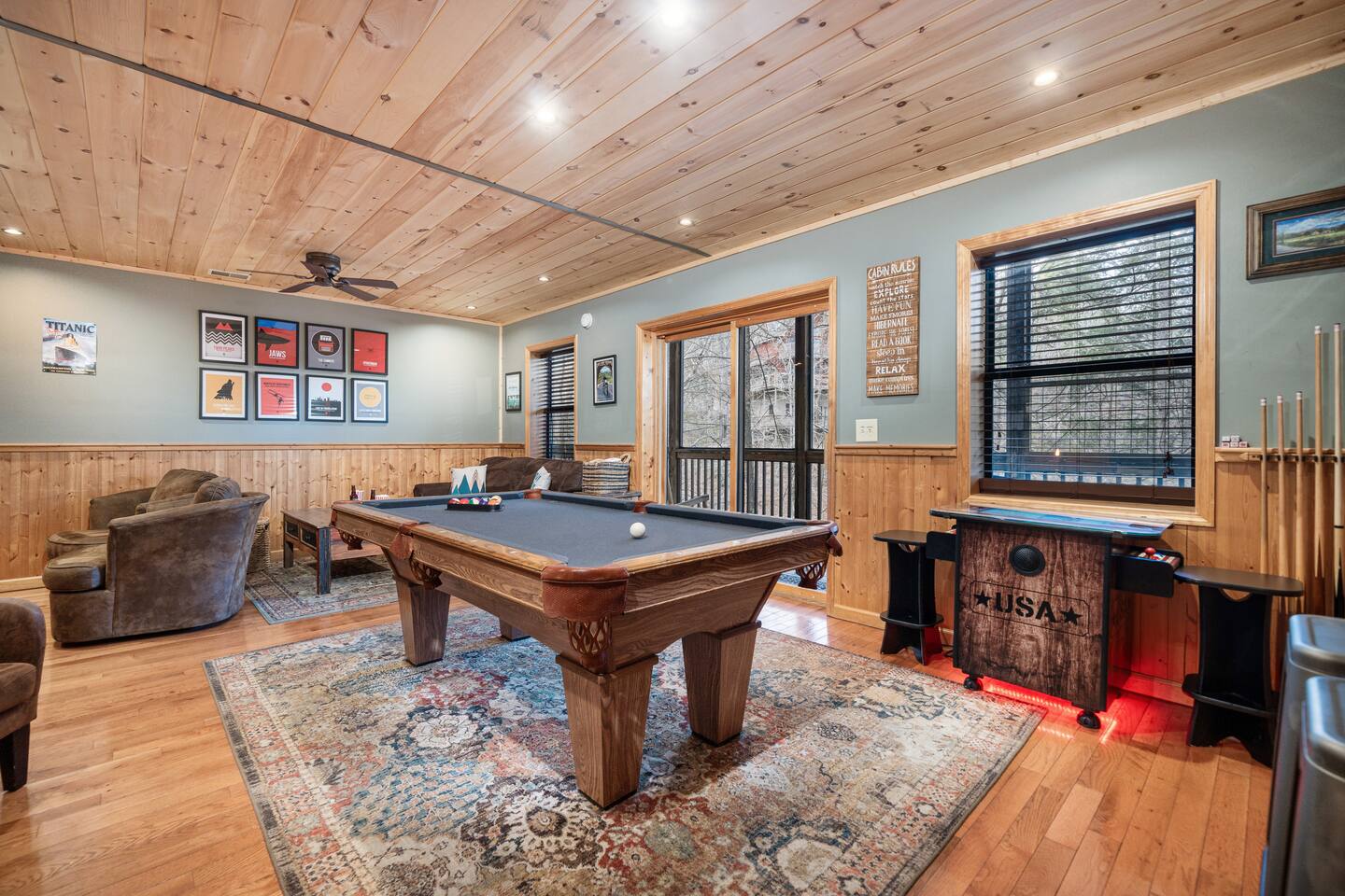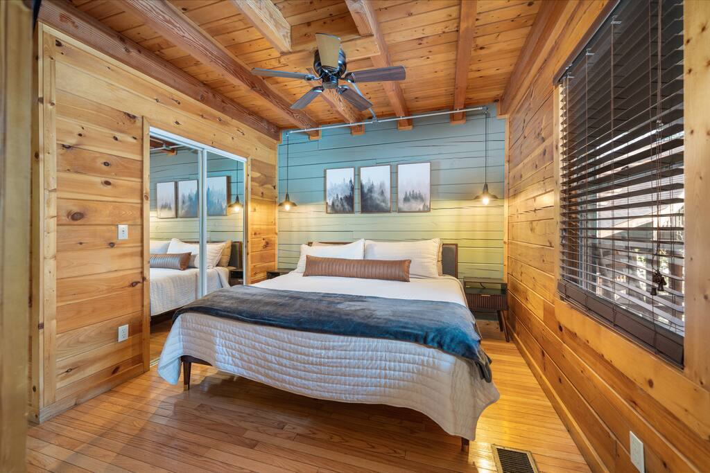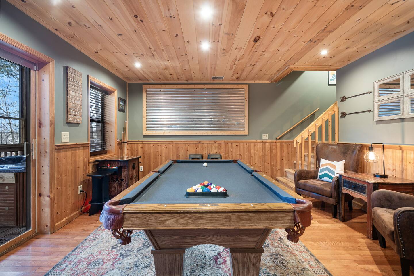 • LOCATION! centrally located in Pigeon Forge (Smoky Mountains) • 2 min drive to Pigeon Forge Parkway! • 8 min drive to Dollywood • Hot tub • Game Room w/ billiard table & arcade games • Community pool just 2 min walking distance from the cabin • 4 bedrooms / 4 bathrooms • Sleeps up to 14 guests • Pet friendly (up to 3 dogs) • Located within the renowned Brookstone Village Resort • Parking for 3+ vehicles • Fully stocked kitchen • All TV’s with 125+ channels and High Speed Wifi • SuperHost