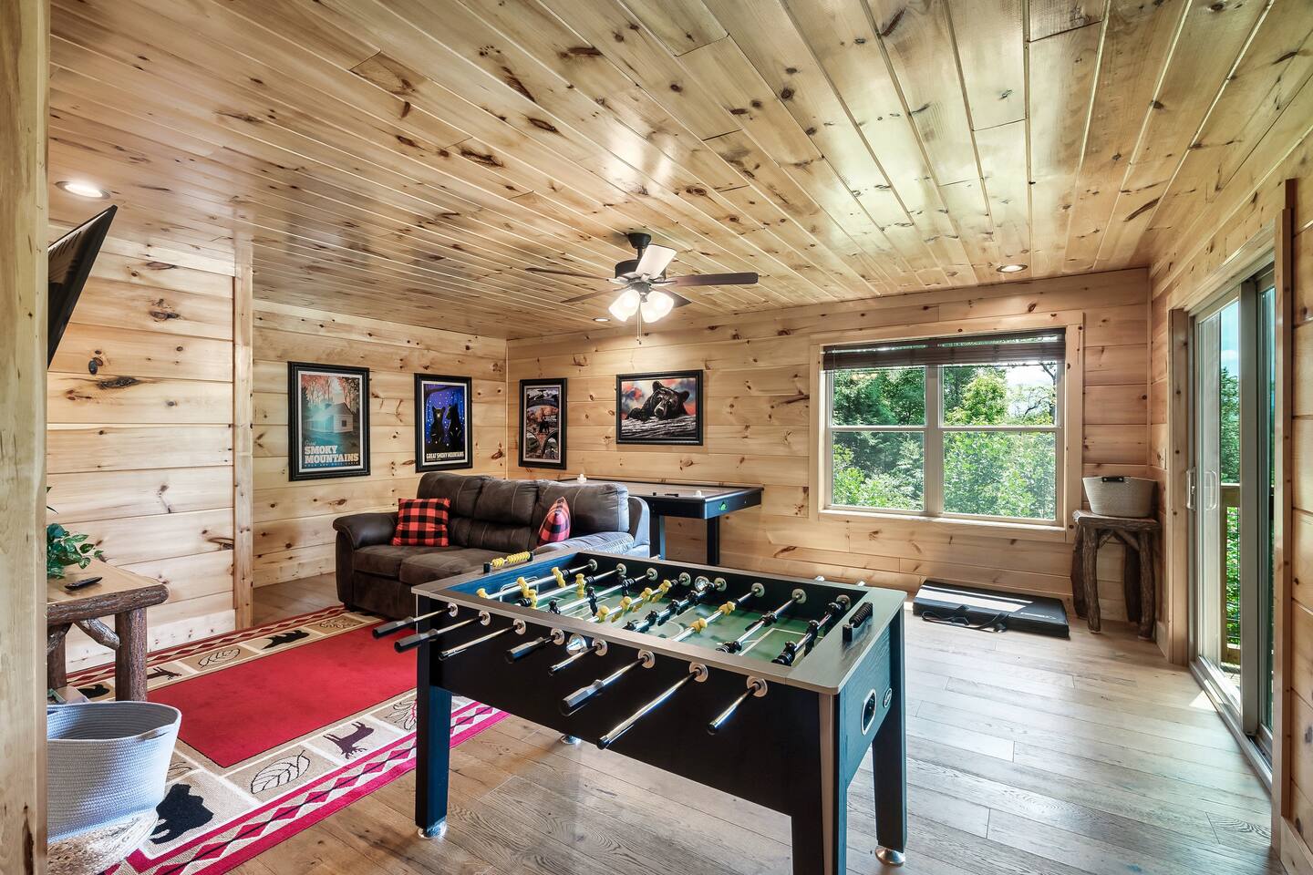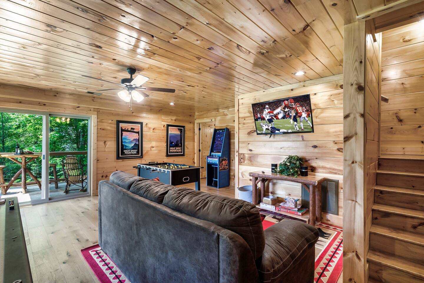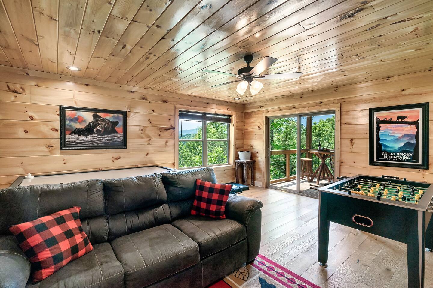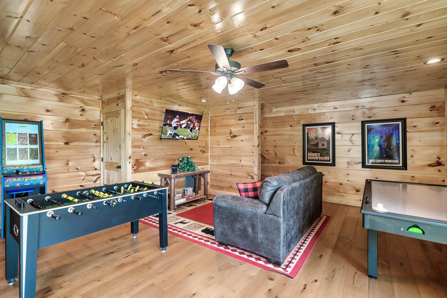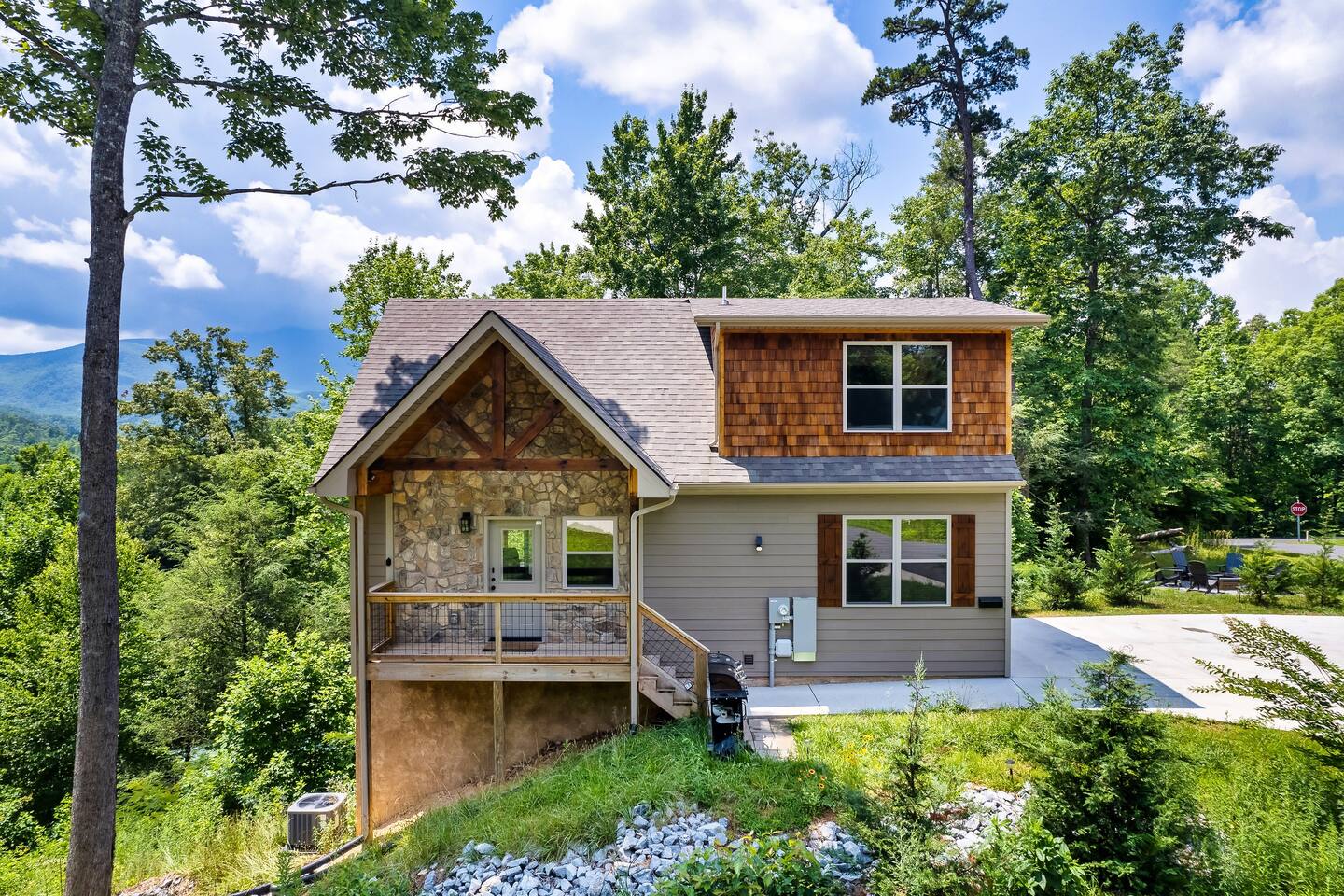 This modern mountain cabin built in 2020 features real stonework and cedar shakes Hardie boards. Perfect for families & groups of friends, everyone can spread out between an expansive Great Room with cathedral ceilings, an entertainment-packed game room, and two relaxing decks with dramatic mountain views. Follow us on FB or Insta: smokymoutainsretreats ► BEDROOMS This three-story cabin accommodates up to 10 guests between the three bedrooms (one on each level) and two queen-size sleeper sofas (one in the living room and one in the game room). You will find a TV in every room. Upper floor: Master Bedroom with a King size bed & en-suite bathroom – sleeps 2 Main floor: Master Bedroom with a King size bed & en-suite bathroom – sleeps 2 Lower floor: Master Bedroom with a King size bed & en-suite bathroom– sleeps 2 Great room: Queen-size sleeper Sofa – sleeps 2 Game room: Queen-size sleeper Sofa – sleeps 2 See pictures of the floor plan in the listing (last pictures). ► KITCHEN The kitchen is equipped with all the cookware, cutlery, and appliances you need to prepare delicious meals during your stay. Refrigerator, stove, microwave, dishwasher, toaster, blender, tea kettle, Crockpot, Keurig Duo with carafe & single serve pod coffee maker. The dining table comfortably seats eight. ► OUTDOOR GRILL There is a private Gas Grill. We provide the Propane Gas. ► OUTDOOR SPACE After a day of hiking and sightseeing, you have a lot of options to chill: *relax by the fire pit *soak in the private hot tub *kick back in the rocking chairs and enjoy the fresh mountain breeze and impressive views towards Mt. LeConte. ► FIRE PIT Our private fire pit is located right by the cabin and offers nice Mountain views. There are 6 outdoor chairs. If you plan on using the fire pit, just remember to bring some fire wood (you can find this at the supermarket next door if needed - 5 min drive). ► GAME ROOM You, your family and guests will love playing in the game room outfitted with an air hockey table, foosball table, video arcade games, and a home theater area for movie nights. There is also an assortment of board games. ► PETS We are a pet friendly cabin and you can bring up to 3 dogs as long as they are house broken/potty trained. We welcome all breeds of dogs and have no restrictions on weight. The pet fee is $150 for the whole stay for up to 3 dogs (the fee is not per dog). ► INTERNET/CABLE High Speed Wireless Internet Smart TVs in the living room/game room as well as in each bedrooms. ► LAUNDRY Full size washer and dryer. ► AMENITIES Our cleaning service provides start-up supplies including: paper towels, dish soap, dish washer soap, kitchen trash can liners, toilet paper, hand soap and bathroom trash liners. Depending on the length of your stay, you may need to purchase additional items when the initial supply runs out. ► PRIVATE PARKING Flat parking for up to 4 vehicles in the driveway. ► ENTRY The front door is equipped with an electronic keypad, we will send a personalized door code. ► SMOKING No Smoking indoors. You can smoke on the decks though. *** Please favorite the property by clicking "save" or "heart shape" in the upper right-hand corner, this will help you find it again and share with others ***