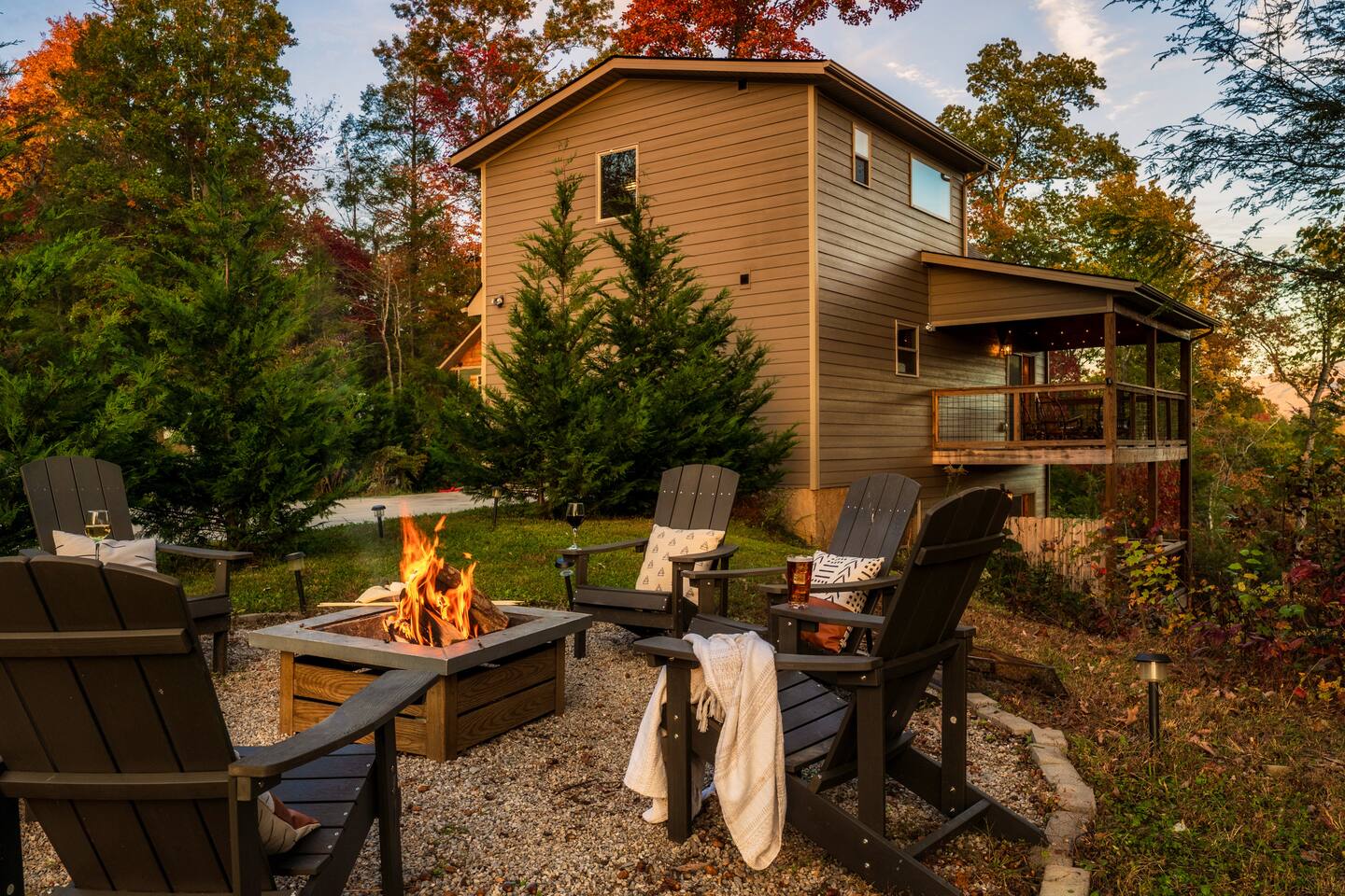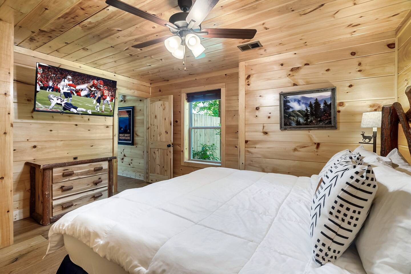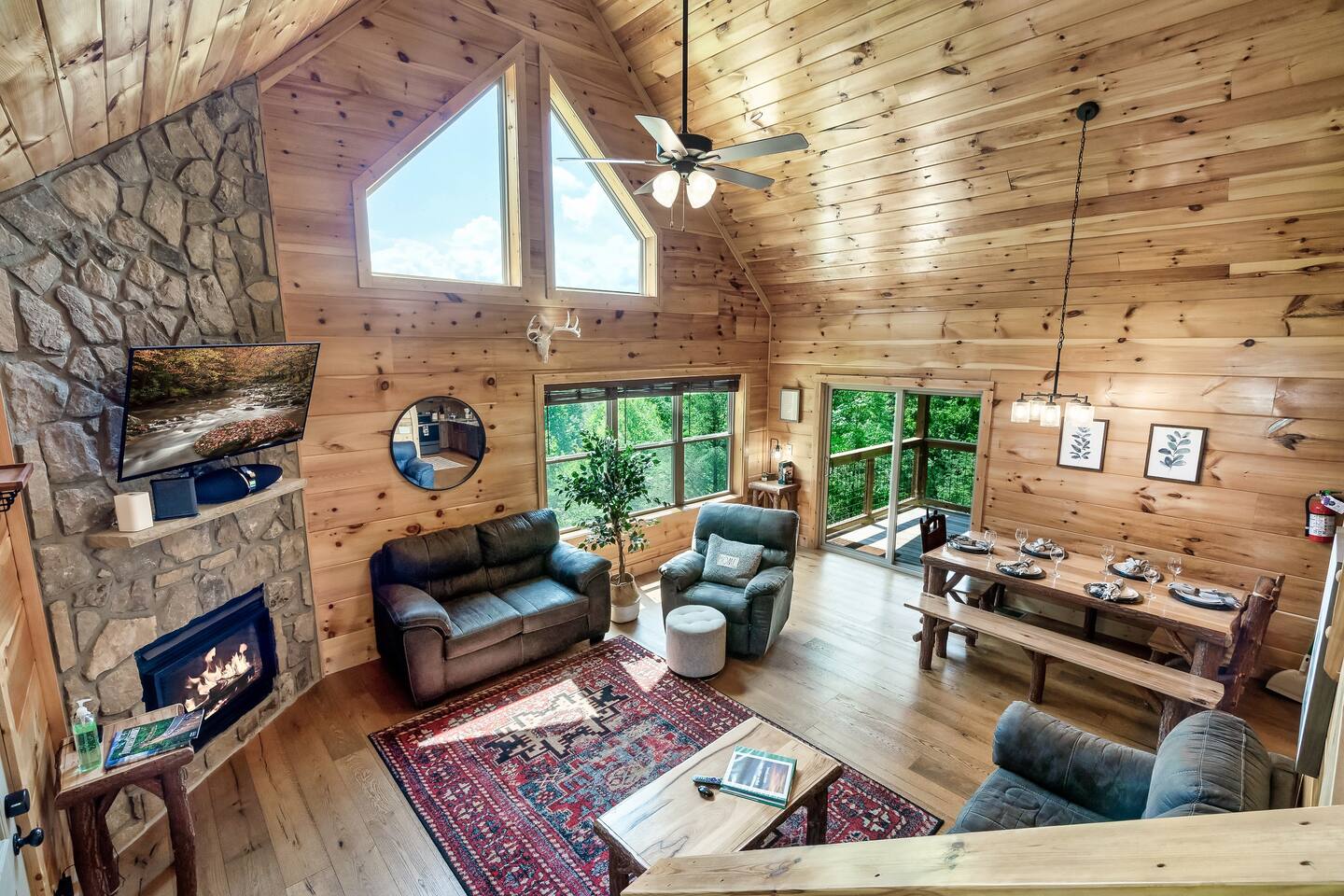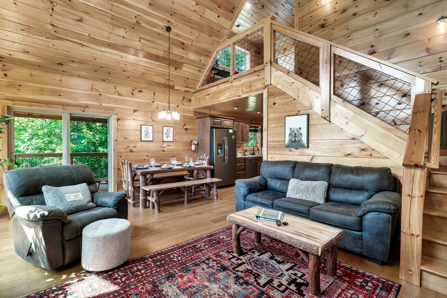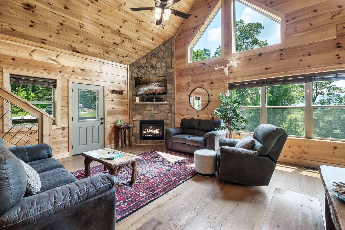 This modern mountain cabin built in 2020 features real stonework and cedar shakes Hardie boards. Perfect for families & groups of friends, everyone can spread out between an expansive Great Room with cathedral ceilings, an entertainment-packed game room, and two relaxing decks with dramatic mountain views. Follow us on FB or Insta: smokymoutainsretreats ► BEDROOMS This three-story cabin accommodates up to 10 guests between the three bedrooms (one on each level) and two queen-size sleeper sofas (one in the living room and one in the game room). You will find a TV in every room. Upper floor: Master Bedroom with a King size bed & en-suite bathroom – sleeps 2 Main floor: Master Bedroom with a King size bed & en-suite bathroom – sleeps 2 Lower floor: Master Bedroom with a King size bed & en-suite bathroom– sleeps 2 Great room: Queen-size sleeper Sofa – sleeps 2 Game room: Queen-size sleeper Sofa – sleeps 2 See pictures of the floor plan in the listing (last pictures). ► KITCHEN The kitchen is equipped with all the cookware, cutlery, and appliances you need to prepare delicious meals during your stay. Refrigerator, stove, microwave, dishwasher, toaster, blender, tea kettle, Crockpot, Keurig Duo with carafe & single serve pod coffee maker. The dining table comfortably seats eight. ► OUTDOOR GRILL There is a private Gas Grill. We provide the Propane Gas. ► OUTDOOR SPACE After a day of hiking and sightseeing, you have a lot of options to chill: *relax by the fire pit *soak in the private hot tub *kick back in the rocking chairs and enjoy the fresh mountain breeze and impressive views towards Mt. LeConte. ► FIRE PIT Our private fire pit is located right by the cabin and offers nice Mountain views. There are 6 outdoor chairs. If you plan on using the fire pit, just remember to bring some fire wood (you can find this at the supermarket next door if needed - 5 min drive). ► GAME ROOM You, your family and guests will love playing in the game room outfitted with an air hockey table, foosball table, video arcade games, and a home theater area for movie nights. There is also an assortment of board games. ► PETS We are a pet friendly cabin and you can bring up to 3 dogs as long as they are house broken/potty trained. We welcome all breeds of dogs and have no restrictions on weight. The pet fee is $150 for the whole stay for up to 3 dogs (the fee is not per dog). ► INTERNET/CABLE High Speed Wireless Internet Smart TVs in the living room/game room as well as in each bedrooms. ► LAUNDRY Full size washer and dryer. ► AMENITIES Our cleaning service provides start-up supplies including: paper towels, dish soap, dish washer soap, kitchen trash can liners, toilet paper, hand soap and bathroom trash liners. Depending on the length of your stay, you may need to purchase additional items when the initial supply runs out. ► PRIVATE PARKING Flat parking for up to 4 vehicles in the driveway. ► ENTRY The front door is equipped with an electronic keypad, we will send a personalized door code. ► SMOKING No Smoking indoors. You can smoke on the decks though. *** Please favorite the property by clicking "save" or "heart shape" in the upper right-hand corner, this will help you find it again and share with others ***